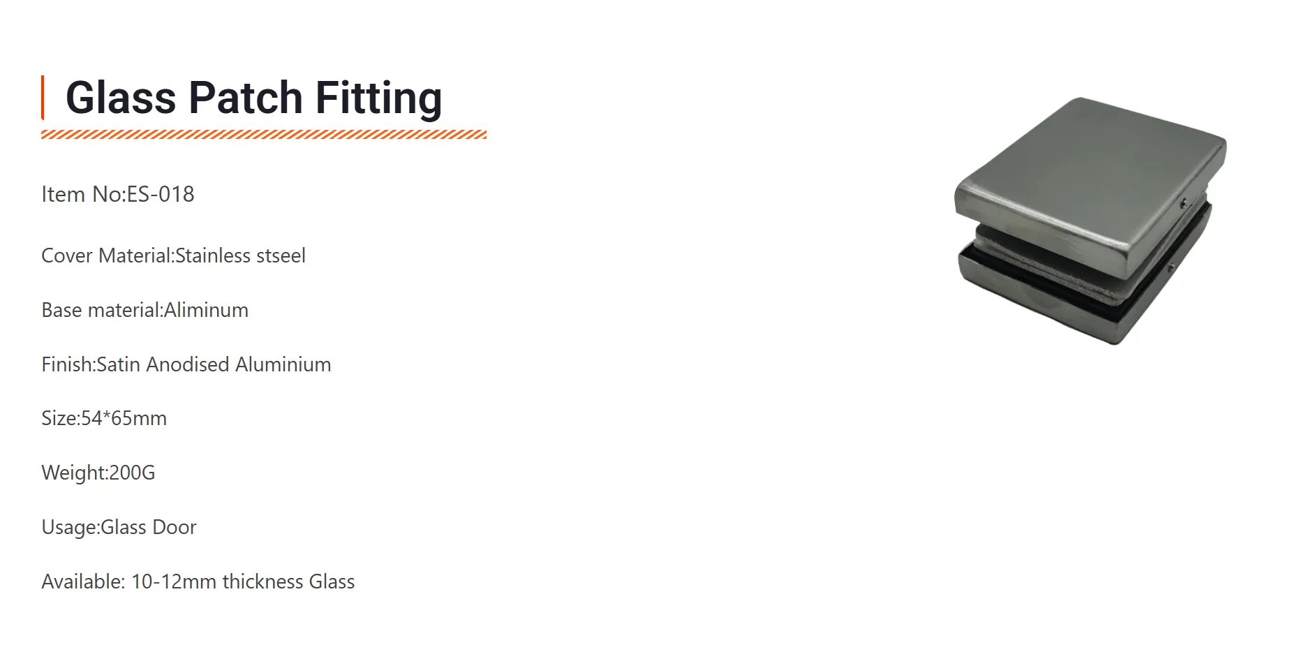 • No drilling holes in glass → reduces risk of breakage. • Easy installation and adjustment. • Strong, durable, and visually clean. • Available in multiple materials and finishes. • Ideal for both indoor and outdoor applications.